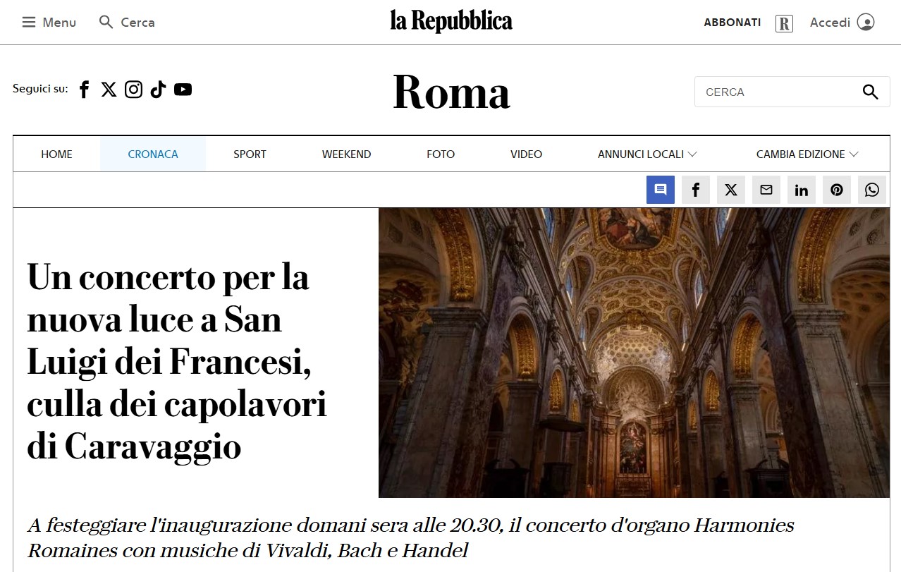 laRepubblica. Un concerto per la nuova luce a San Luigi dei Francesi, culla dei capolavori di Caravaggio