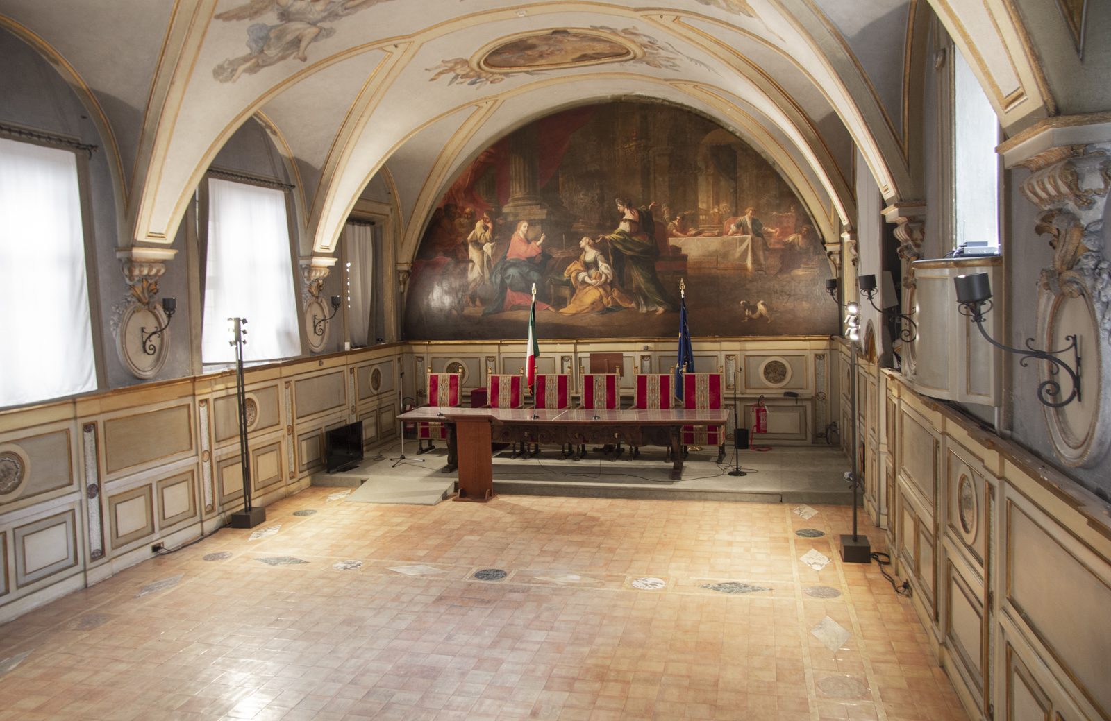 The Sala della Sacrestia is located inside the Vicolo Valdina Complex, which consists of a former convent of the Benedictine nuns of S. Maria in Campo Marzio, the adjoining church dedicated to S. Gregorio Nazianzeno, a Romanesque bell tower and a cloister 16th century with a fountain in the center. Originally the convent refectory room, now mainly used for conferences and art exhibitions, it is characterized by a large vault with a series of eighteenth-century frescoes and, in the background, the painting of the Cenacle of sixteenth-century origin. For the new system we studied custom lighting fixtures, handcrafted to perform three different lighting tasks: the enhancement of the architecture thanks to the fixtures positioned on the candelabra, aimed at lighting the vaults and for reflection, providing diffused lighting in the room , the enhancement of the frescoes by means of fixtures installed on a vertical structure in the window compartments near the end walls that also guarantee functional lighting on the speakers’ table and finally a system of special floor lamps, aimed at integrating functional lighting of the Hall and wired for emergency in order to guarantee minimum illuminance in the event of a power failure.