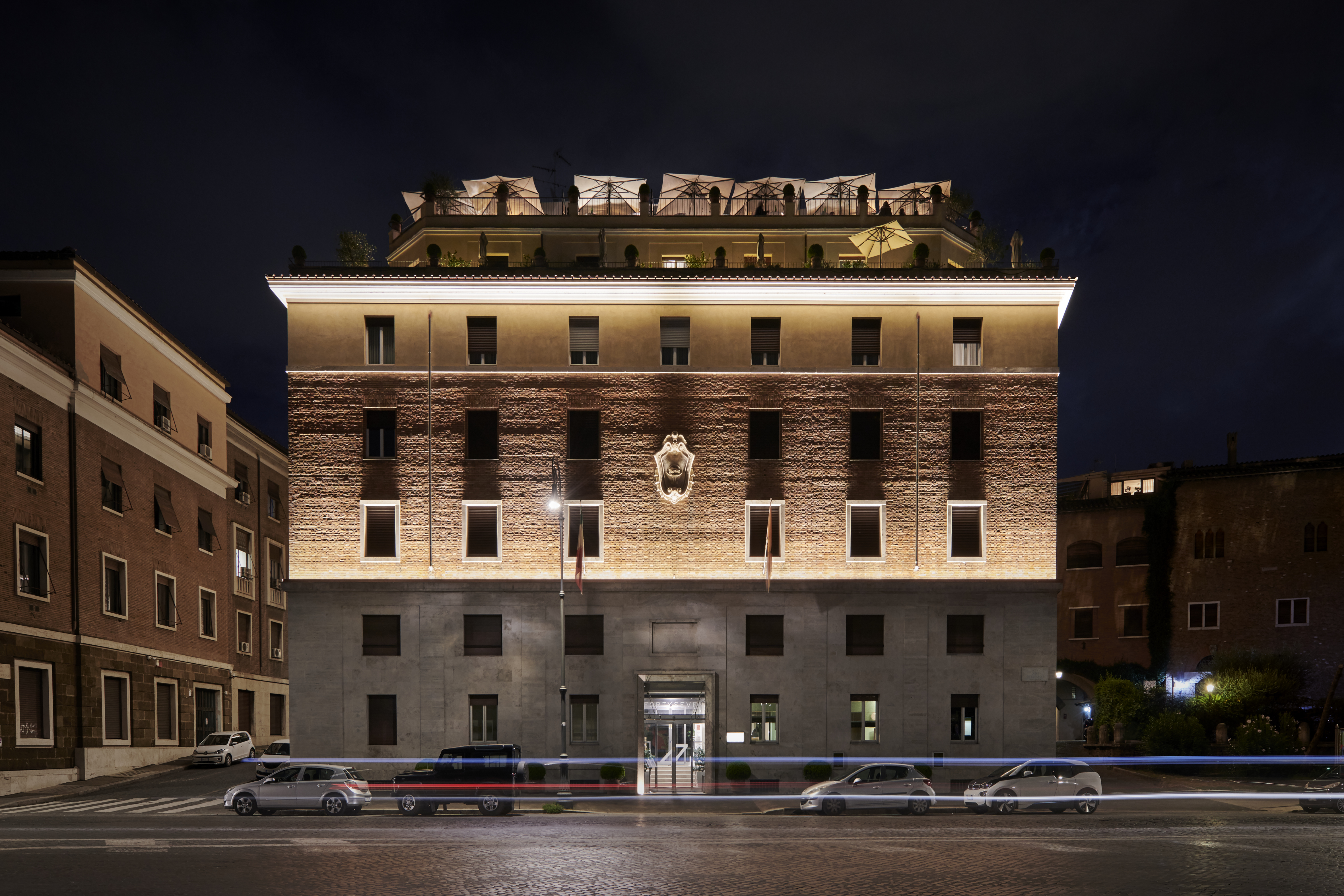 47 Boutique Hotel spicca per la bellezza della sua architettura, immerso nel cuore dell’area archeologica, visibile da Piazza della Bocca della Verità, dal Lungotevere e da Via Petroselli. Gli interventi richiesti hanno riguardato gli esterni dell’Hotel: in particolare le Facciate principali, la Corte interna e il Rooftop. L’austerità dell’architettura razionalista, espressa esclusivamente attraverso due fasce di materiali, è stata enfatizzata attraverso un’illuminazione lineare continua che valorizza la matericità della parte in mattoni delle Facciate. La Corte interna è caratterizzata da bucature regolari, che abbiamo interpretato come grandi pixel di una media facade. Nel Rooftop l’illuminazione segue fedelmente le decorazioni scelte dall’ Arch. Emilia Lamacchia, di cui si esalta la volumetria dello spazio di maggior qualità occupato dal 47 Circus Roof Garden, che ospita un ristorante e un cocktail bar da cui è possibile ammirare tutta la bellezza di Roma.