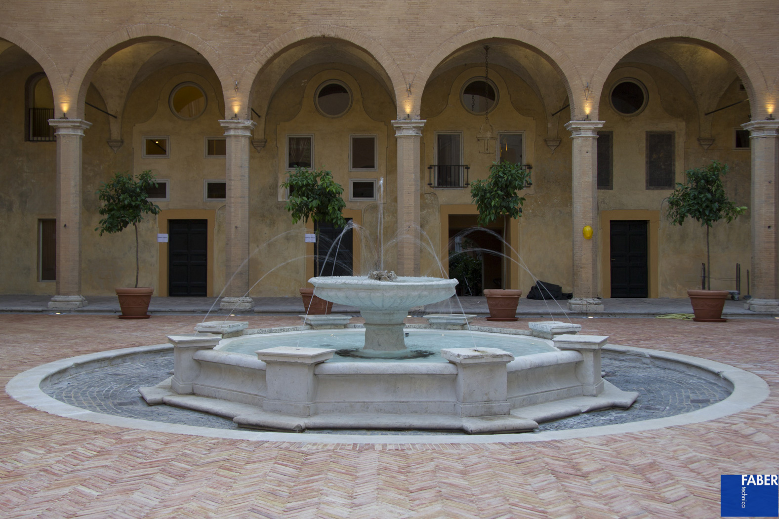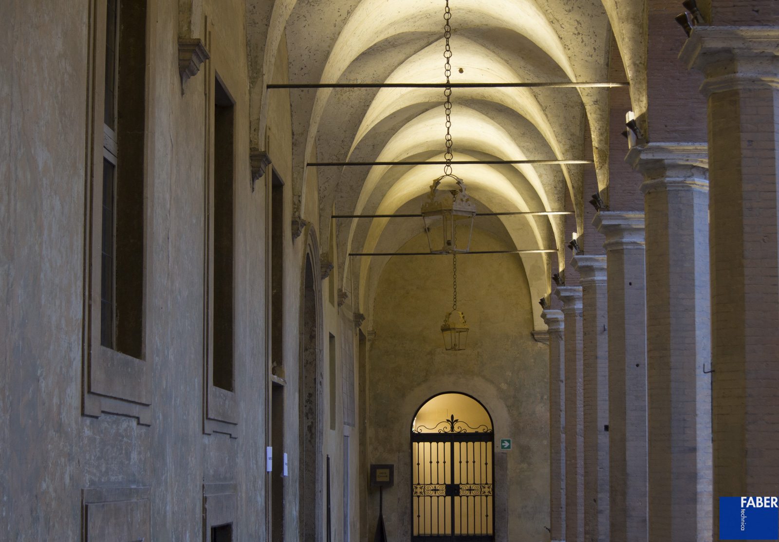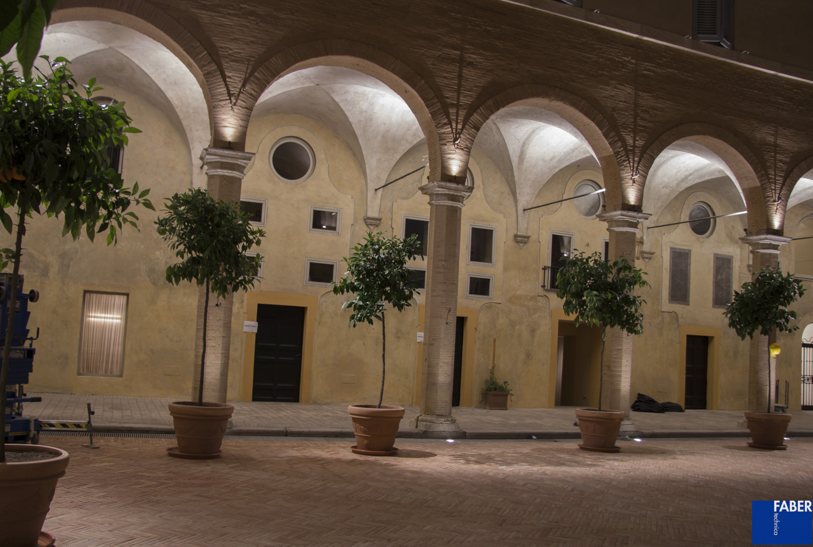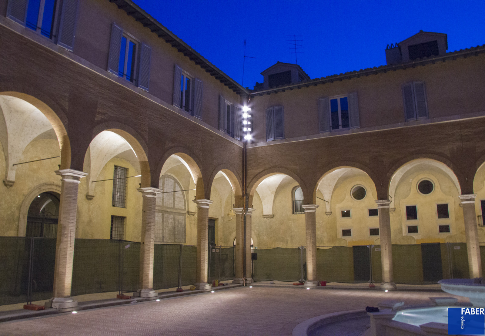 Il nuovo sistema di illuminazione ha come obiettivo principale l’equilibrio delle luminanze sulle superfici orizzontali e verticali, così da esaltare la qualità spaziale ed i volumi architettonici del chiostro, nel rispetto del comfort visivo dei fruitori, studiato in base alle esigenze funzionali. Particolare attenzione in fase di progetto ed installazione è stata dedicata all’equilibrio tra vuoti e pieni per ottenere una luce morbida che esalta i materiali e il recente restauro conservativo, a tal proposito è stata svolta una specifica selezione delle finiture degli apparecchi per garantirne la coerenza con il valore del luogo e la sua storia. Sono stati studiati inoltre diversi scenari di luce per venire incontro alle esigenze funzionali del chiostro che può essere usato come palcoscenico per concerti, eventi di beneficenza etc., rispettando a pieno il vicinato riducendo al minimo ogni forma di inquinamento luminoso sia verso edifici adiacenti che verso l’alto.