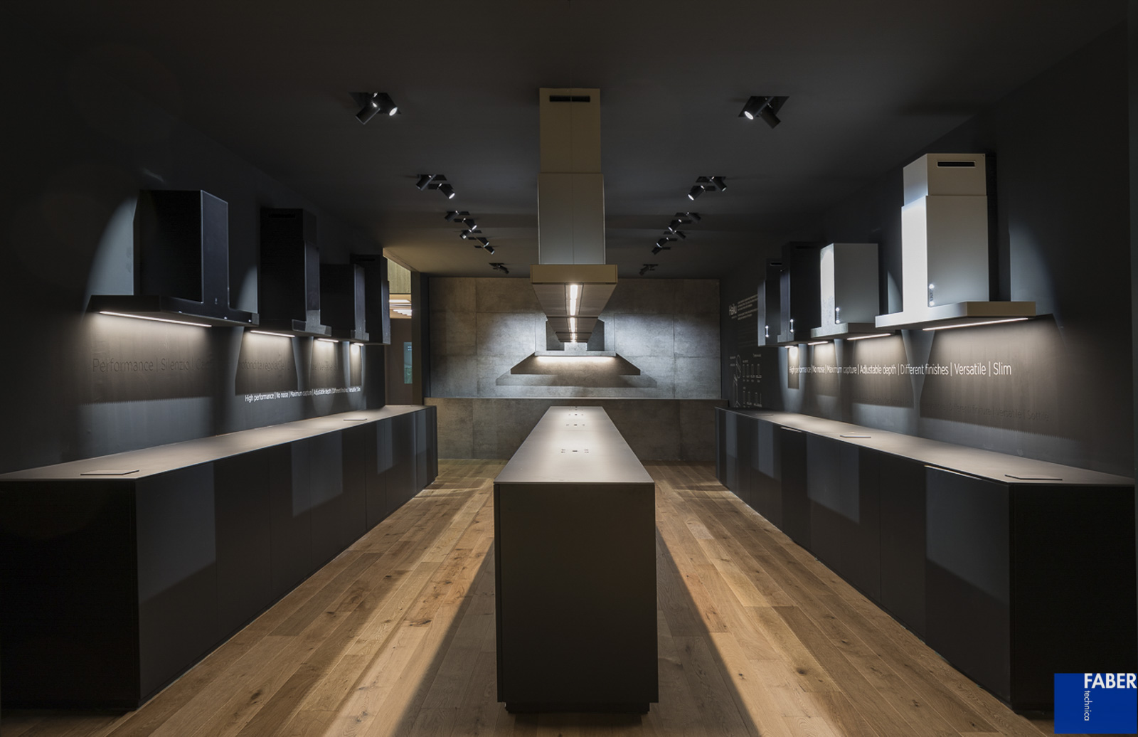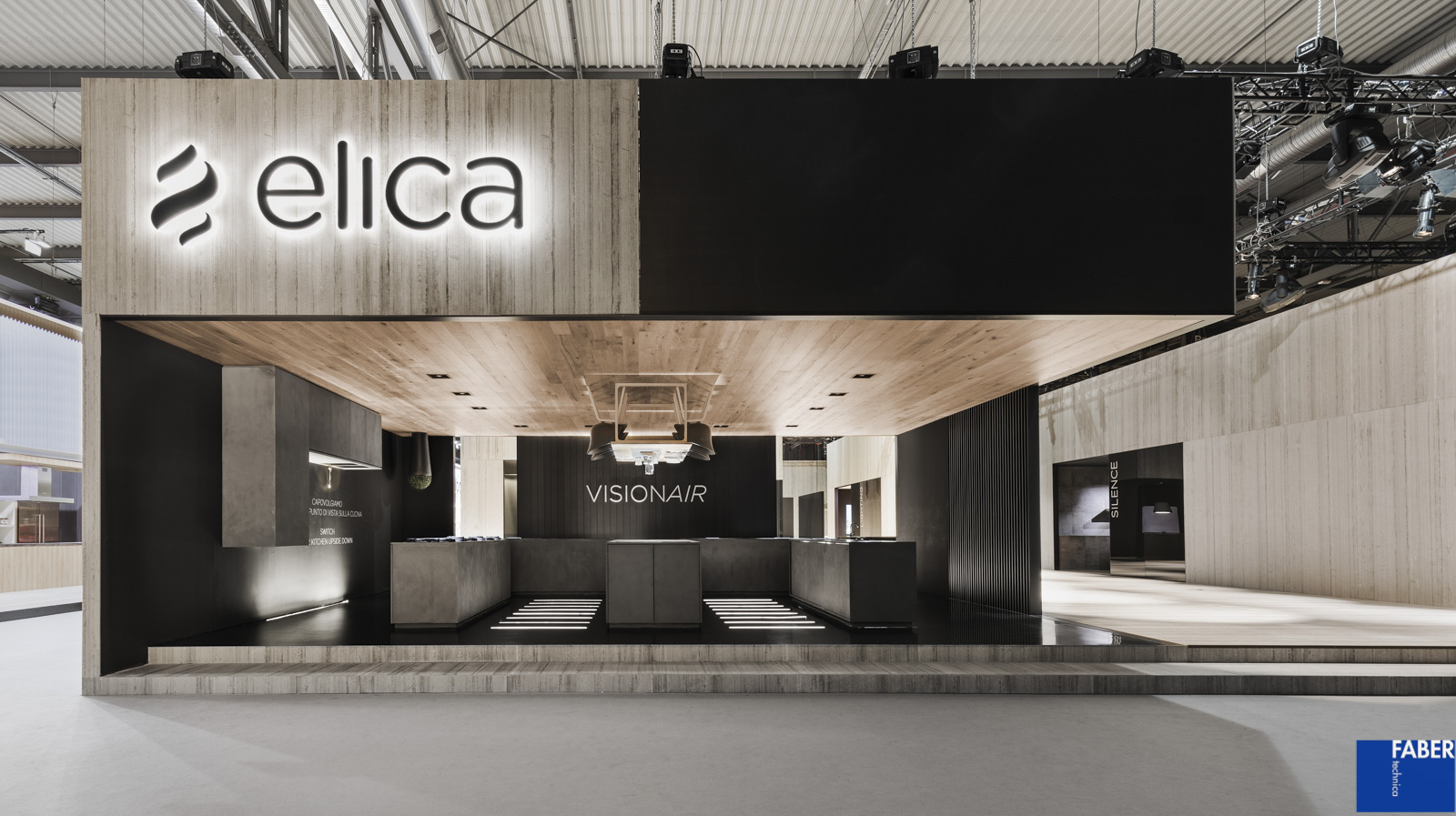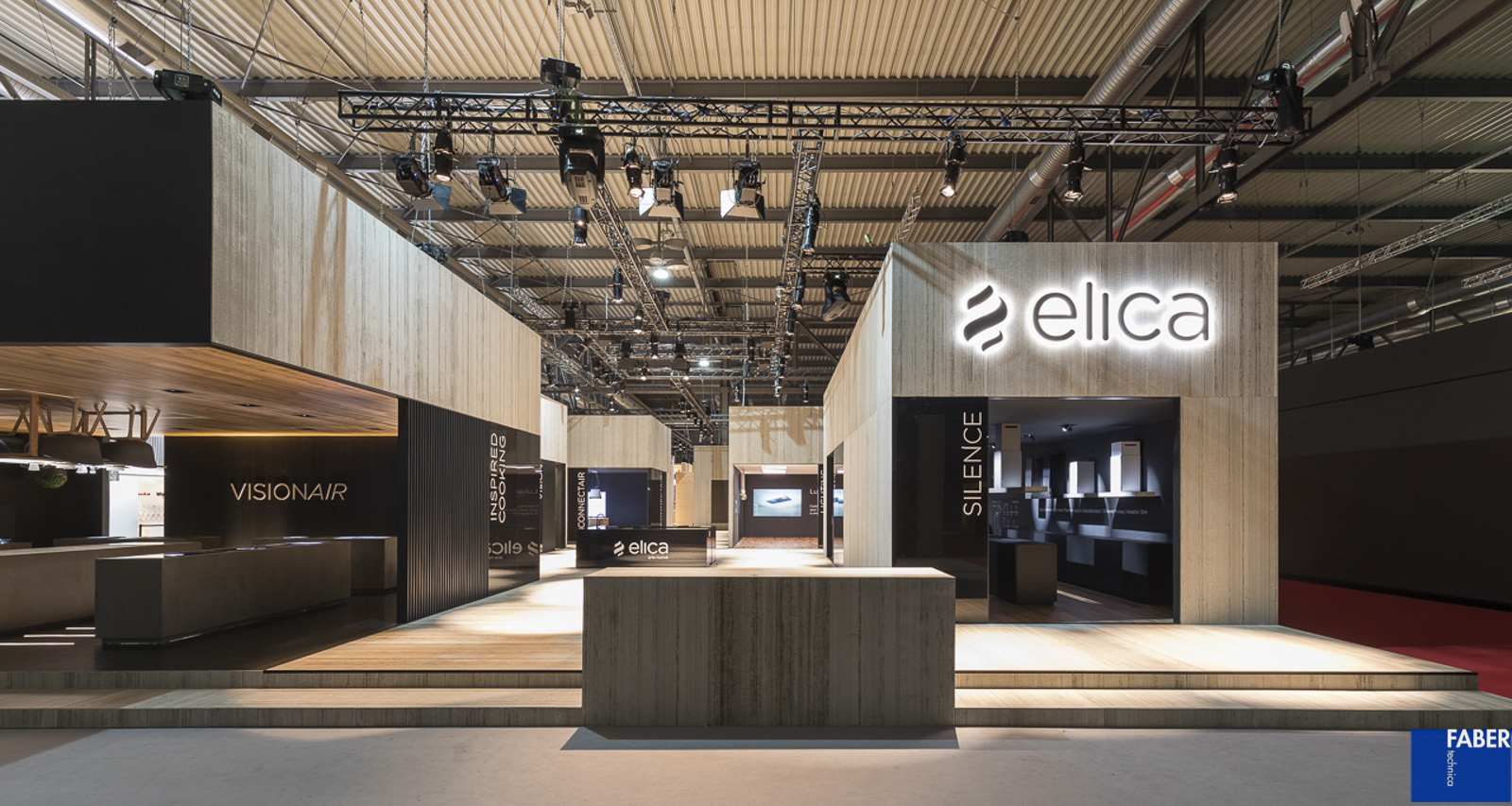 Lo stand Elica a Eurocucina, progettato dallo studio di architettura Labics in collaborazione con Fabertechnica per gli aspetti inerenti l’illuminazione, è ispirato dall’idea di città. Uno spazio articolato, aperto e continuo in cui una serie di edifici costituiscono le stanze, spazi interni, metafora della casa e dello spazio domestico. Il tema della stanza consente di venire a contatto con le novità presentate dal brand, di conoscere ed interagire con esse in una modalità più intima mentre l’ampio spazio pubblico, costituito come nella città da strade e piazze, permette di fare l’esperienza dell’azienda nella sua totalità. Per l’illuminazione abbiamo pensato ad una luce diffusa calda per creare un’atmosfera domestica, che converge in zone di luce più fredda, laddove si vuole evidenziare il carattere fortemente tecnologico del prodotto elica. La dialettica tra elementi complementari, declinata nella scelta dei materiali e di tonalità della luce, è stata enfatizzata da effetti chiaroscurali e variazioni di direzione di provenienza dei fasci di luce. La volontà è creare gerarchie visive e chiavi di interpretazione degli spazi dell’abitare sempre diversi, in linea con il concept elica, che trova la massima espressione nell’ambiente Inspired cooking dove la cucina si ribalta e la luce aiuta a percepire questo mondo sotto sopra. L’azione quotidiana, ordinaria della cappa, di aspirare vapore, si trasforma in un momento di spettacolo nello spazio Silence, dove periodicamente le cappe si attivano per aspirare fumo, che assume consistenza e colore in maniera dinamica con la luce, grazie all’impiego della domotica e della connettività (IOT, Internet of Things), altro elemento innovativo su cui punta Elica.