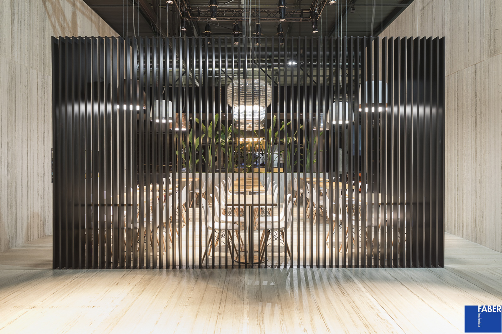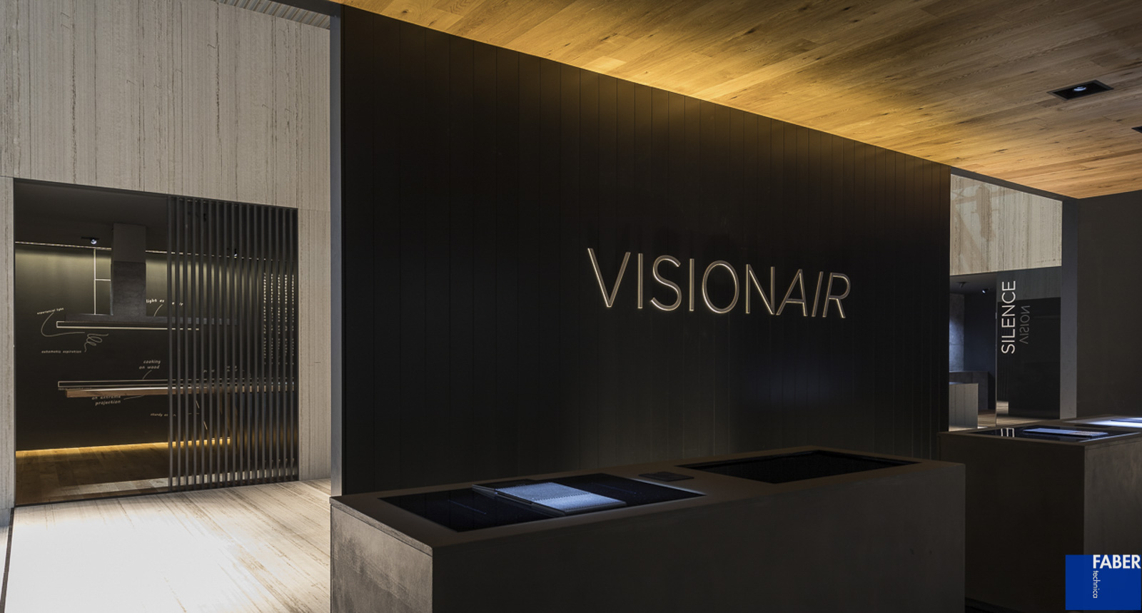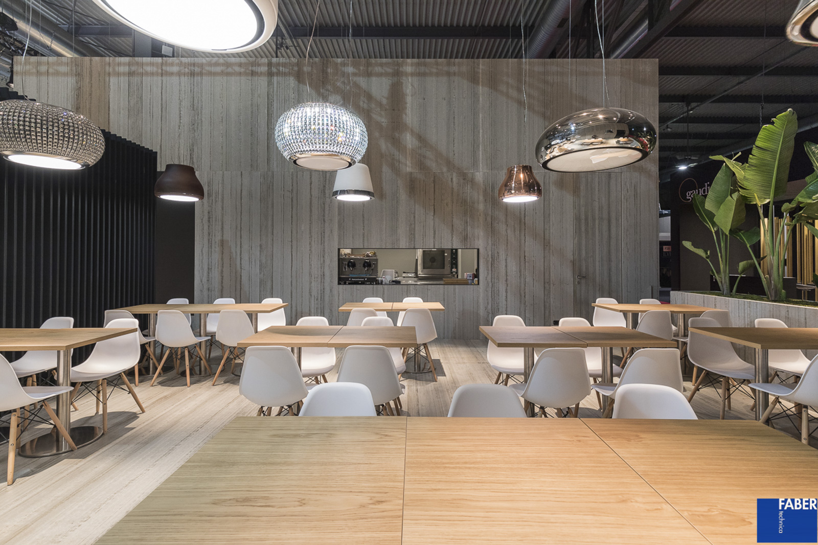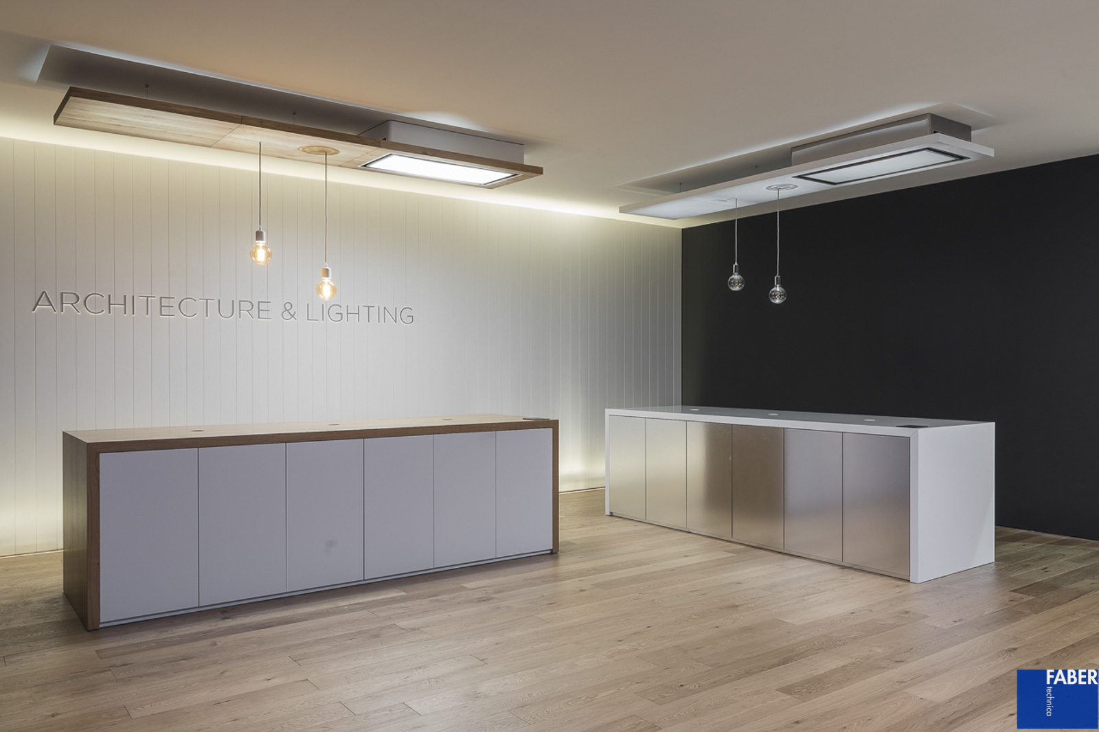 Lo stand Elica a Eurocucina, progettato dallo studio di architettura Labics in collaborazione con Fabertechnica per gli aspetti inerenti l’illuminazione, è ispirato dall’idea di città. Uno spazio articolato, aperto e continuo in cui una serie di edifici costituiscono le stanze, spazi interni, metafora della casa e dello spazio domestico. Il tema della stanza consente di venire a contatto con le novità presentate dal brand, di conoscere ed interagire con esse in una modalità più intima mentre l’ampio spazio pubblico, costituito come nella città da strade e piazze, permette di fare l’esperienza dell’azienda nella sua totalità. Per l’illuminazione abbiamo pensato ad una luce diffusa calda per creare un’atmosfera domestica, che converge in zone di luce più fredda, laddove si vuole evidenziare il carattere fortemente tecnologico del prodotto elica. La dialettica tra elementi complementari, declinata nella scelta dei materiali e di tonalità della luce, è stata enfatizzata da effetti chiaroscurali e variazioni di direzione di provenienza dei fasci di luce. La volontà è creare gerarchie visive e chiavi di interpretazione degli spazi dell’abitare sempre diversi, in linea con il concept elica, che trova la massima espressione nell’ambiente Inspired cooking dove la cucina si ribalta e la luce aiuta a percepire questo mondo sotto sopra. L’azione quotidiana, ordinaria della cappa, di aspirare vapore, si trasforma in un momento di spettacolo nello spazio Silence, dove periodicamente le cappe si attivano per aspirare fumo, che assume consistenza e colore in maniera dinamica con la luce, grazie all’impiego della domotica e della connettività (IOT, Internet of Things), altro elemento innovativo su cui punta Elica.
