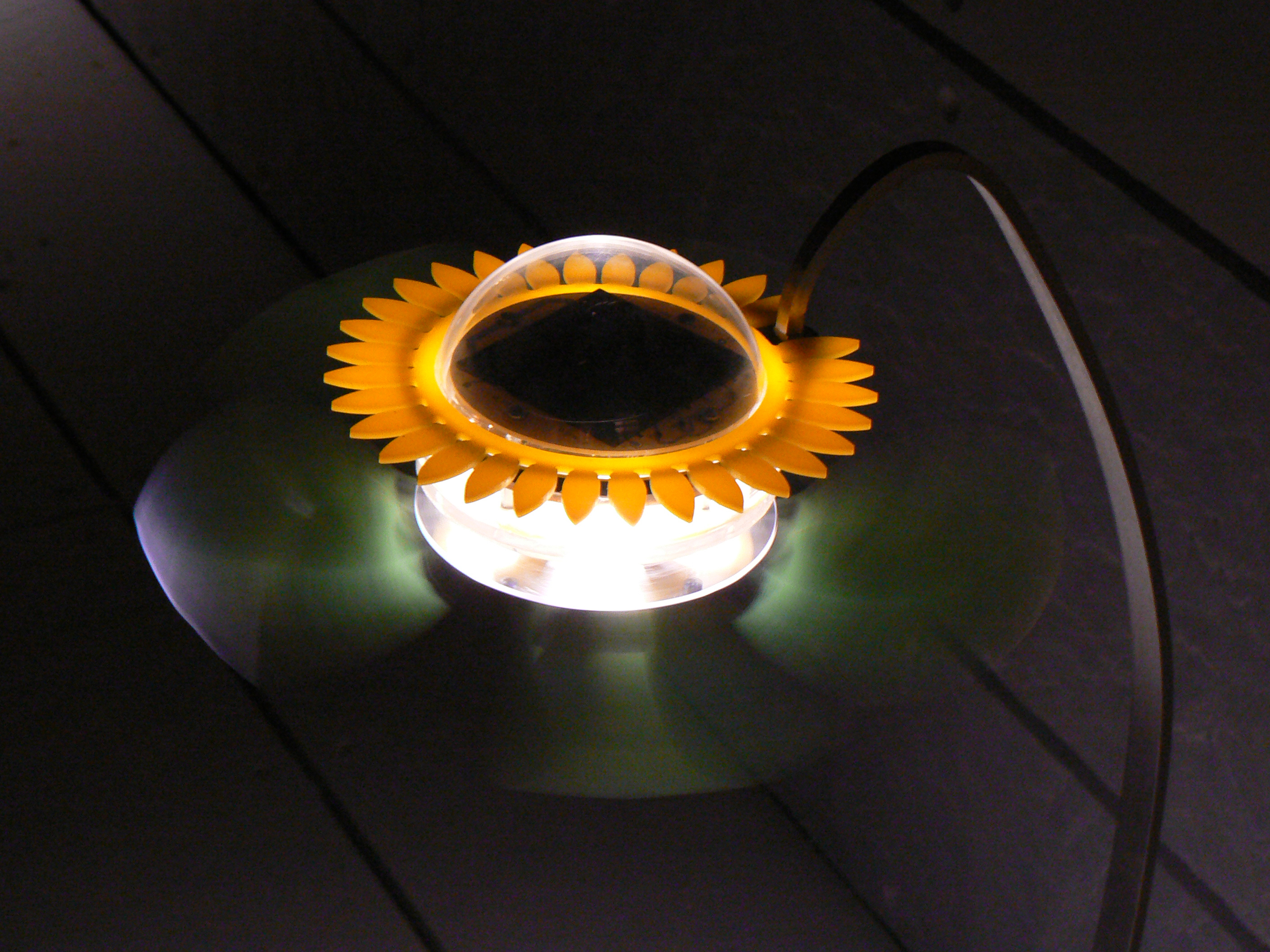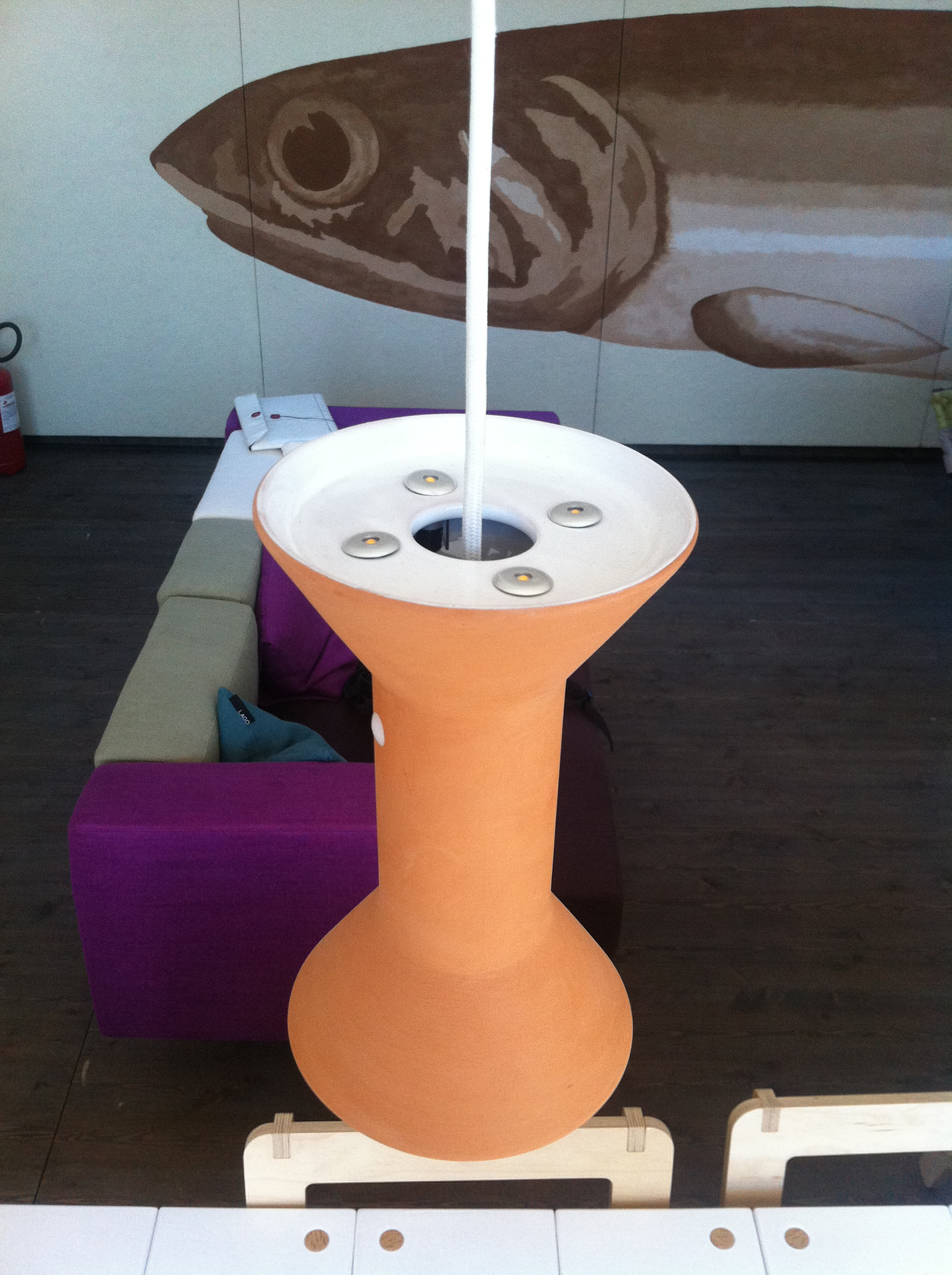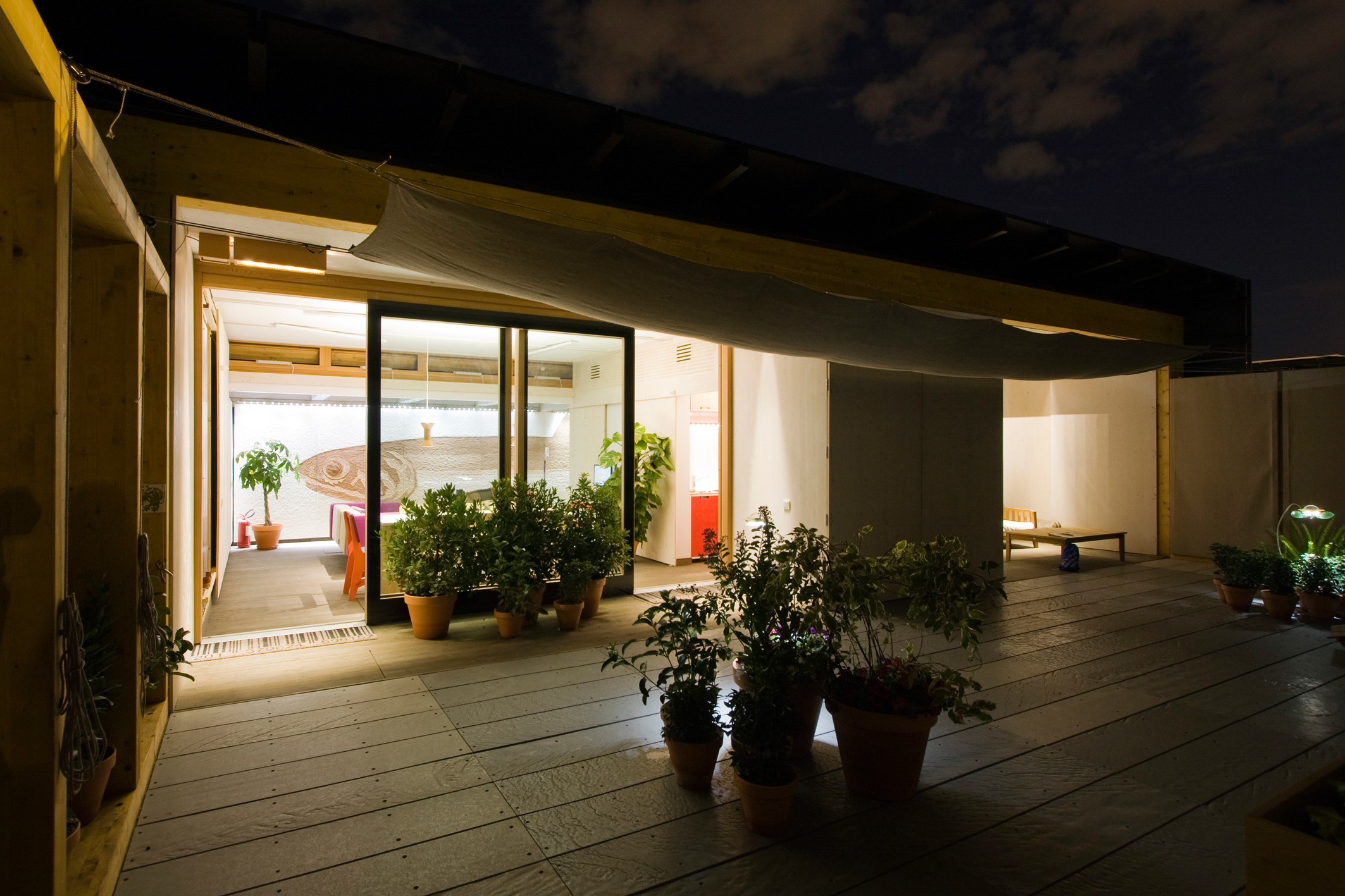 Solar Decathlon 2012 è la gara internazionale ideata dal Dipartimento Energia degli Stati Uniti, un’Olimpiade dell’architettura green. MED in Italy è il progetto di un team composto da docenti e studenti dell’Università di Roma TRE in collaborazione con il Laboratorio di disegno industriale della Sapienza, arrivato terzo alla competizione sezione Architettura”. È la prima volta in 12 anni, a partire dalla prima edizione di Solar decathlon nel 1999, che un team italiano viene ammesso alla competizione mondiale dell’architettura sostenibile. La casa Med in Italy affonda le sue radici nella tradizione del sud del Mediterraneo, il clima di riferimento è quello caldo temperato della penisola italiana. Le strategie base prevedono la protezione dall’irraggiamento solare, l’accumulo inerziale del calore e la sua dissipazione sfruttando l’alternanza di temperature tra il giorno e la notte. Tali necessità combinate di raffrescamento estivo e riscaldamento invernale implicano una configurazione variabile e una logica gestionale per adattare l’edificio alle diverse sollecitazioni. Per rispondere a queste esigenze è stato concepito un sistema-involucro che è in grado di modificare il suo assetto per adattarsi alle sollecitazioni climatiche stagionali e giornaliere e di consumare energia cinque volte in meno rispetto alle abitazioni tradizionali utilizzando materiali costruttivi tipici della tradizione mediterranea. Il progetto illuminotecnico, sviluppato da Marco Frascarolo (con il contributo di Vincenzo Cristallo per le lampade di ceramica e della Società DGA) ha cercato di garantire massimo comfort visivo e risparmio energetico, con una calda atmosfera, in stile di vita Mediterraneo. Sono stati sviluppati quattro sistemi di illuminazione custom: un sistema lineare per una superficie pittorica di 11 metri, un sistema puntuale a sospensione per la zona living e la zona notte (adattabile a misura, che permette di modificare il punto di origine e di altezza delle sorgenti luminose a sospensione), un sistema di illuminazione delle logge. Il sistema, alimentato da binari elettrificati inseriti nei giunti che separano i pannelli radianti a soffitto, permette di variare il numero ed il tipo di sospensioni, di cambiarne la posizione lungo l’asse longitudinale e sull’asse trasversale, attraverso un supporto rotante per l’apparecchio, denominato Elica. L’ accensione avviene tramite crepuscolare.